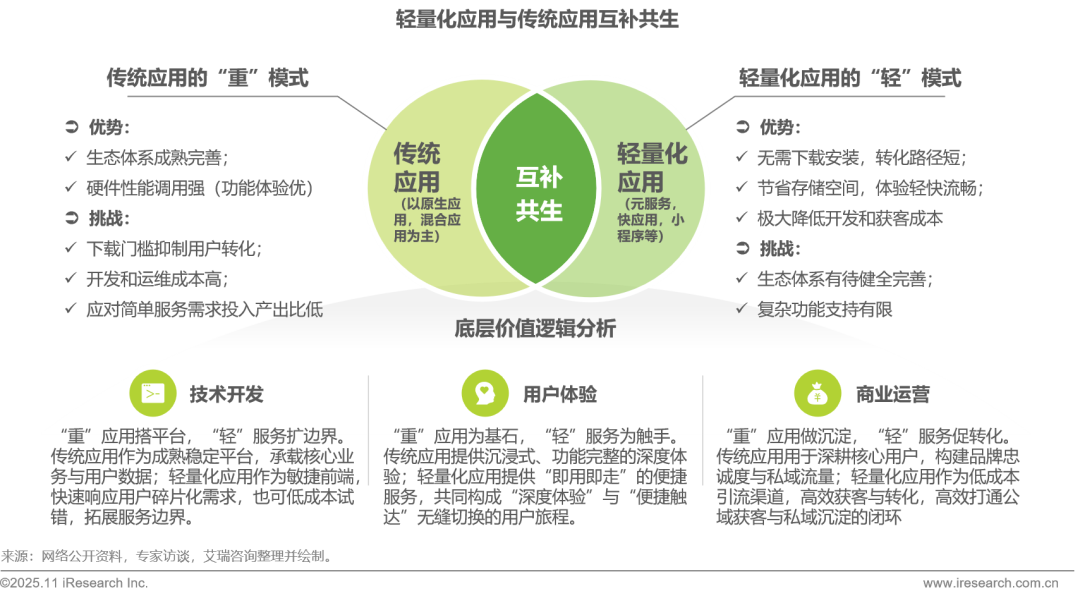 互补逻辑:传统应用生态成熟、功能完整,支撑深度体验并沉淀核心用户;轻量化应用转化路径短、开发成本低,契合碎片化场景且支持快速试错,二者协同构建出移动应用服务矩阵。