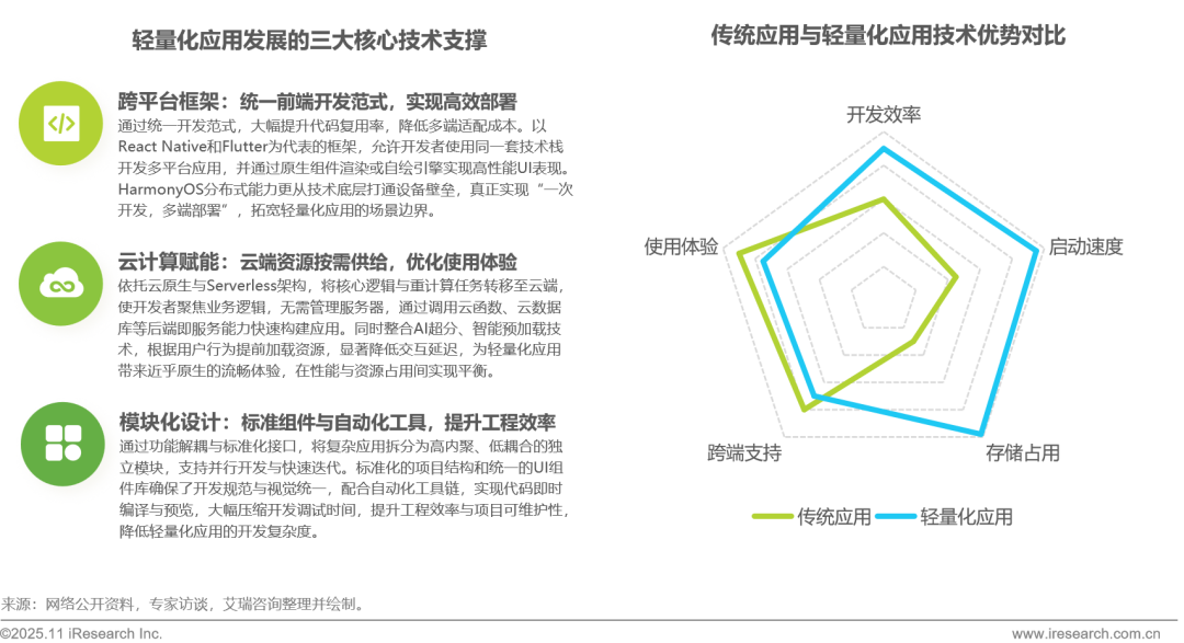 技术进步是轻量化应用发展的底层驱动力。跨平台框架通过统一开发范式提升代码复用率,降低多端适配成本;云计算赋能将资源与算力向云端聚合,优化资源供给与部署流程;模块化设计通过功能解耦与标准化接口,提升开发效率与系统可维护性。三者分别从开发范式、资源供给、工程方法三个不同维度,系统性地解决了轻量化应用在效率、成本和敏捷性上的核心挑战,共同构成轻量化应用快速发展的坚实基础。相较于传统应用,轻量化应用技术在开发效率、启动速度、存储占用上展现出明显优势;虽在极端复杂交互场景略有妥协,但其综合技术优势精准契合存量市场“降本增效”与“快速触达”的核心诉求。