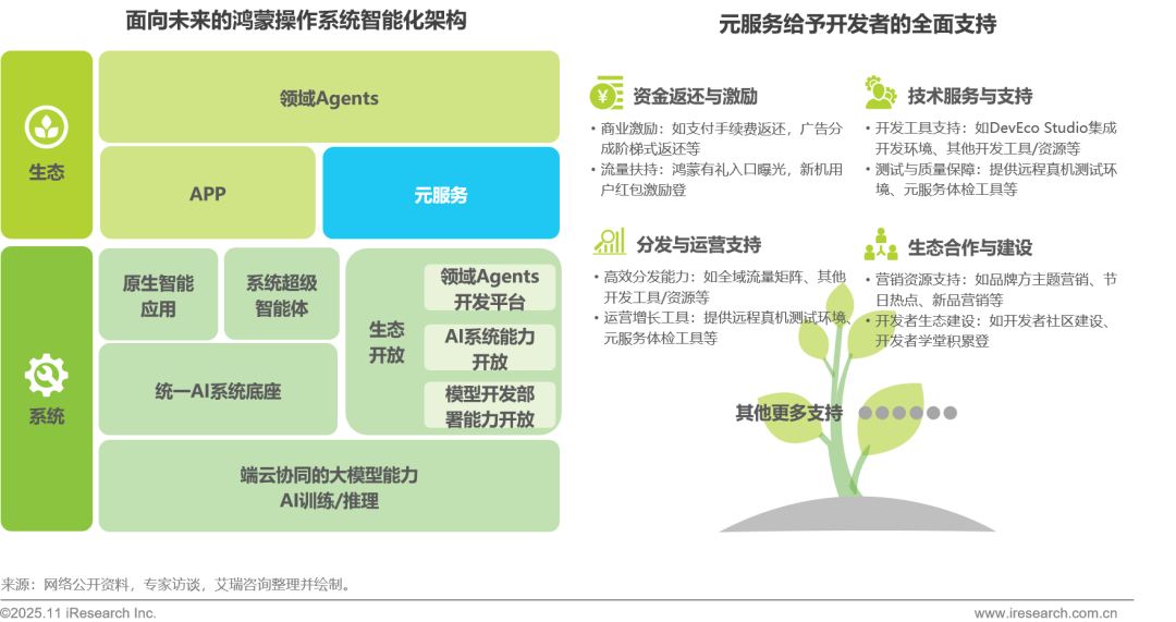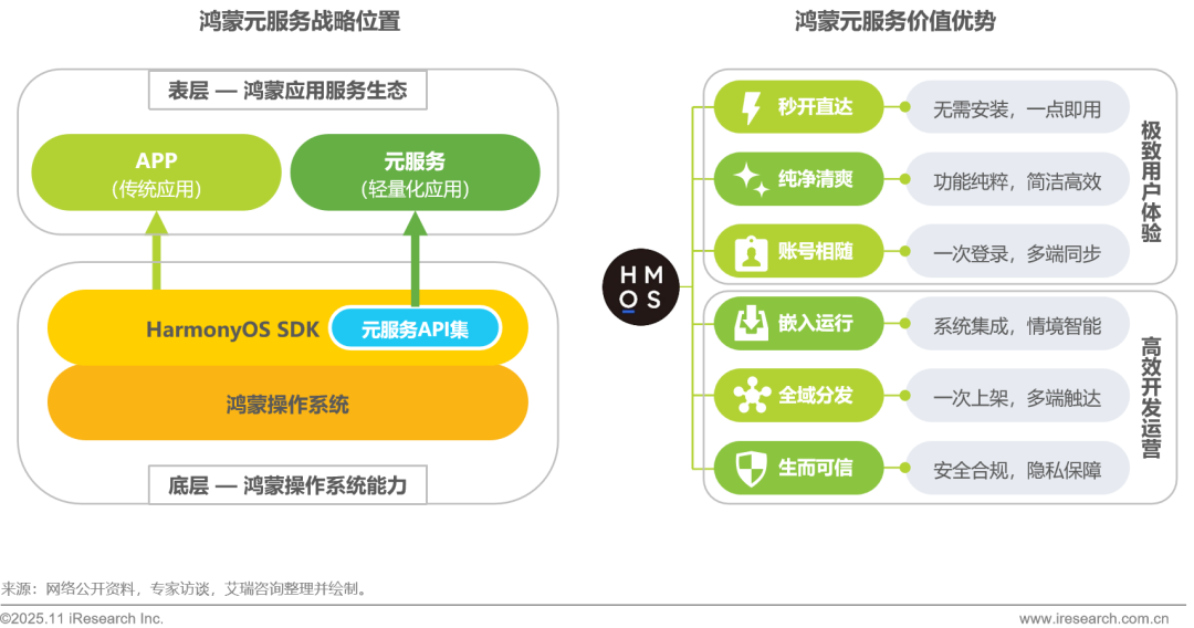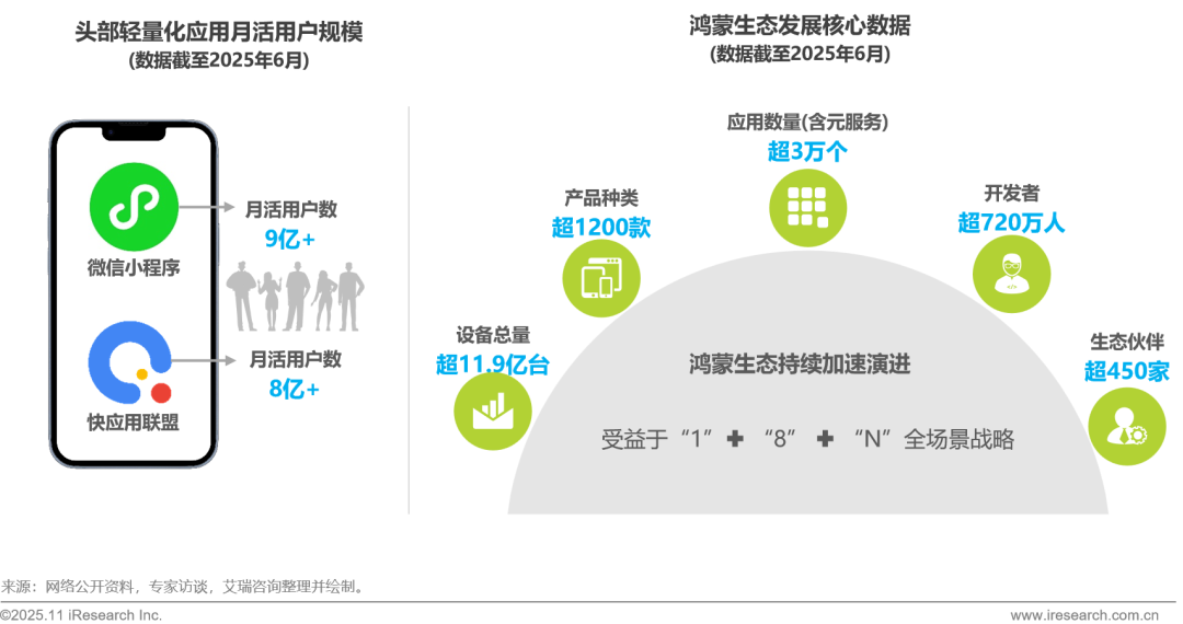 当前头部轻量化应用中,微信小程序凭借社交场景的深度渗透,月活用户超9亿;快应用联盟则通过多厂商协同的生态布局,月活用户超8亿,两者均已形成规模化发展态势;此外,鸿蒙生态也已呈现出强劲发展势头,截至2025年6月,其应用数量(含元服务)已突破2.5万个,覆盖产品种类超1200款,设备总量达11.9亿台,并凝聚了720万开发者和450家生态伙伴。未来鸿蒙生态将继续在 “1+8+N” 全场景战略深化的加持下加速前进,而基于鸿蒙生态的元服务也必将具备广阔的发展空间。