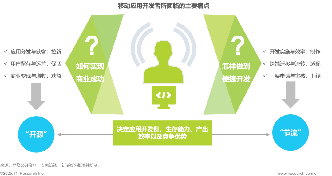 当前移动应用开发者核心痛点集中于商业变现与高效开发两大维度,在创收,亦即“开源”方面,开发者面临获客成本高企、用户活跃度难维系、变现路径不清晰等压力;在降本,亦即“节流”方面,则需应对技术门槛高、多端适配复杂、开发周期长等瓶颈。这两大痛点直接决定了应用产品的生存能力、产出效率与市场竞争力,是影响开发项目成败的关键。同时“开源”与“节流”也是贯穿开发过程的重要考量,影响整体成本与效能,亟需通过生态级解决方案打通从开发投入到商业回报的闭环。