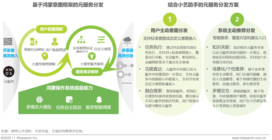 针对传统分发模式被动等待用户请求的局限性,元服务依托鸿蒙意图框架,实现了从“被动检索”到“主动感知推荐”的分发模式变革。该模式基于鸿蒙操作系统底层能力,通过用户意图理解与服务需求解析,借助全局意图协议实现服务功能智能解构,精准捕捉用户潜在需求。结合小艺助手双向交互能力,不仅支持用户通过语音、搜索等主动意图直达服务,还能基于业务事件、地理位置等信息动态自适应推荐,并通过多模态交互打造 “界面即服务” 的沉浸体验。这种高效分发机制让服务具备提前洞察并匹配用户需求的能力,在显著提升转化效率的同时,也为开发者提供了精准主动的用户高效触达新路径。