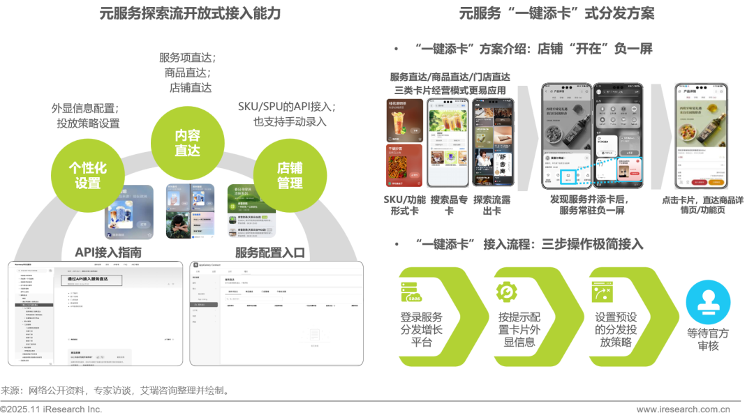 元服务探索流开放式接入,通过完善的API接口与服务后台模版式配置,为开发者提供个性化设置、店铺管理以及核心的内容直达功能,助力开发者高效完成服务卡片的一次接入、多流量场的精准分发。同时搭配元服务“一键添卡” 式分发方案,仅需三步极简操作接入,即可将店铺以卡片形式部署在负一屏,有效提升分发获客效率并支撑获客后的可持续运营。