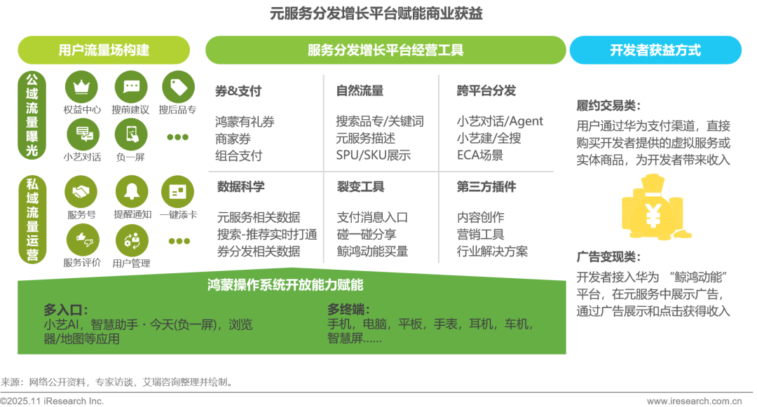 面对中小开发者普遍存在的商业化基础设施薄弱、获客成本高企及变现路径模糊等核心痛点,元服务通过构建系统级公私域联动流量场,配套内置支付、营销及数据分析工具,通过多终端覆盖(手机、车机等)实现履约交易(华为支付直接购买)与广告变现(鲸鸿动能平台)双轨收益模式,系统化解商业化基建缺失、流量获取难等困局,实现从流量触达到收入转化的可持续链路闭环,显著降低商业化门槛,助力开发者聚焦核心服务,驱动商业收益的可持续增长。