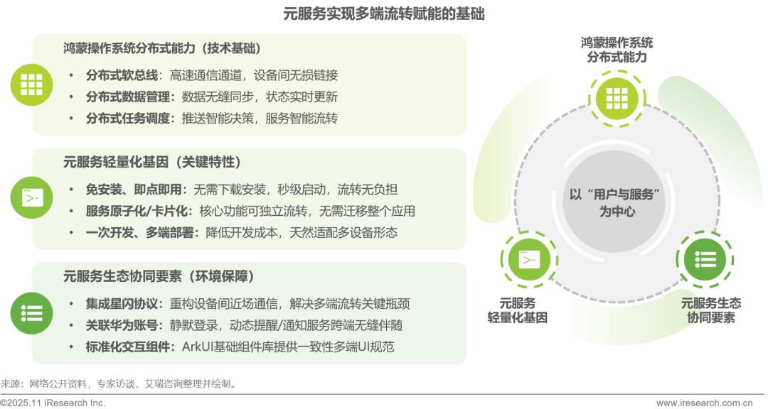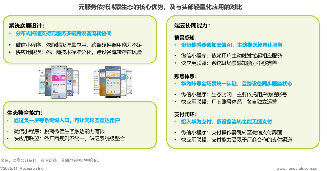 鸿蒙凭借其分布式系统架构、端云协同全链路能力及系统级生态整合三大核心特性,为元服务构筑了微信小程序和快应用等传统轻量化方案难以复制的生态护城河。基于分布式软总线与端云协同等技术底座,元服务不仅实现了全场景服务的无缝流转,更具备系统级智能主动触达的能力,从而在轻量化应用的全场景竞争中展现出显著的差异化优势与发展前景。