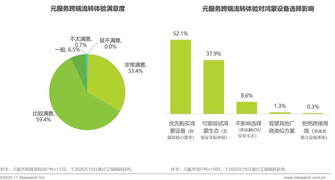 元服务跨端流转体验获得用户广泛认可,满意度高达92.8%。更重要的是,元服务跨端流转体验还会显著影响用户设备选择倾向,过半数元服务用户表示会因跨端体验而优先购买鸿蒙设备,近四成用户也因此更愿意尝试鸿蒙生态设备,表明元服务的跨端流转能力不仅是用户体验优势,更成为鸿蒙生态重要的差异化竞争力,有效推动用户从服务体验向设备选择的转化。
