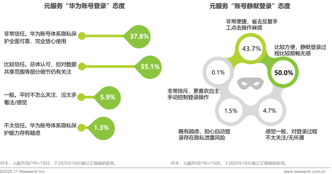 元服务用户对 “华为账号登录” 信任度极高,持非常信任与比较信任态度的用户合计超九成,体现出华为账号体系在安全可靠性方面已建立广泛用户信心。对于 “账号静默登录”,超九成用户认可其便捷性,仅少数用户存在隐私顾虑,整体反映出元服务在登录环节的隐私安全保障与便捷性体验得到用户普遍推崇。