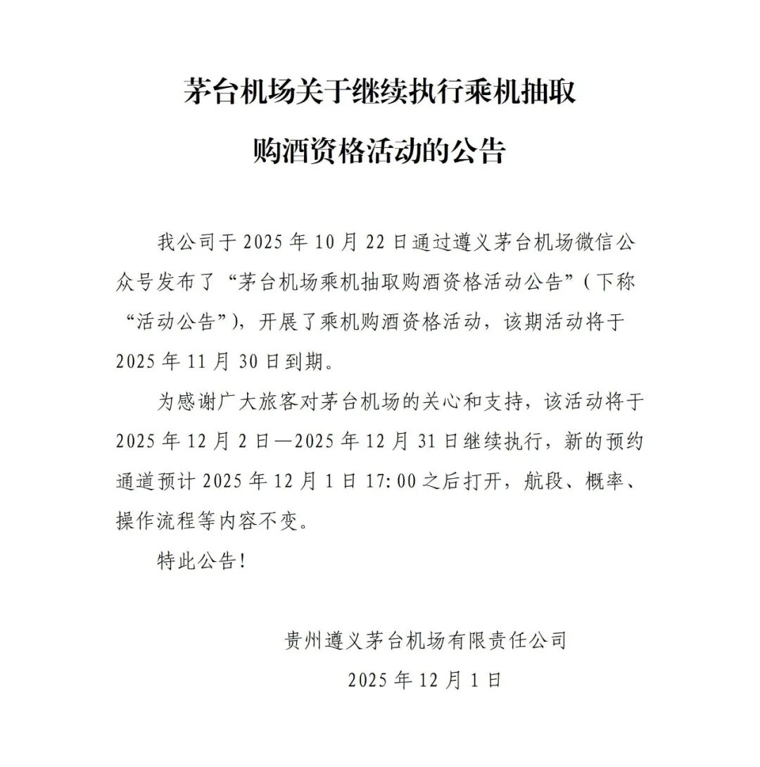 12月1日,茅台机场公告,“乘机抽取购酒资格活动”将于12月2日至12月31日继续执行。