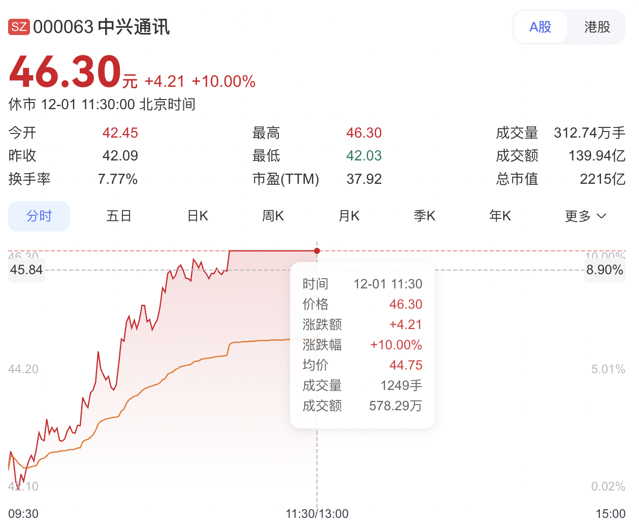 上述消息公布后,中兴通讯股价今日上午强势涨停,报46.30元,成交金额超139亿,封单金额超40亿元,其H股也涨超11%。