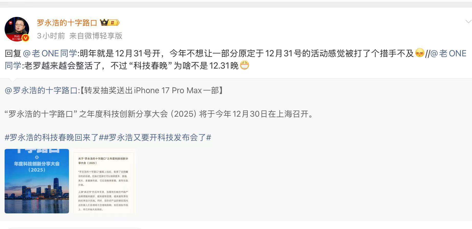 12月1日,罗永浩在个人微博发长文宣布,“罗永浩的十字路口”之年度科技创新分享大会(2025)将于今年12月30日在上海召开。据罗自己透露,大会将给大家集中介绍一批令人印象深刻,但还没彻底走进大众视野的中国创新型科技产品。