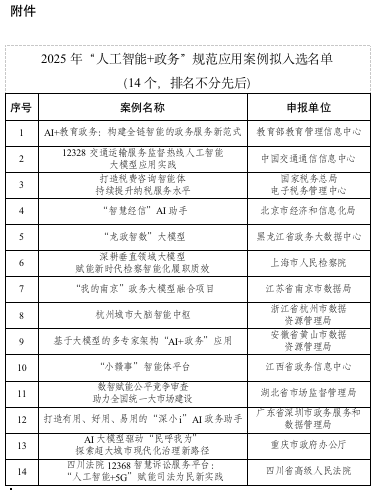“网信中国”消息,为安全稳妥有序推进人工智能大模型在政务领域应用,在中央网信办信息化发展局指导下,中国网络社会组织联合会面向各级党政机关和事业单位开展2025年“人工智能+政务”规范应用案例征集工作。经组织专家评审,并征求有关单位意见,评选出14个案例。为进一步听取社会各界意见,现将拟入选的2025年“人工智能+政务”规范应用案例名单进行公示。