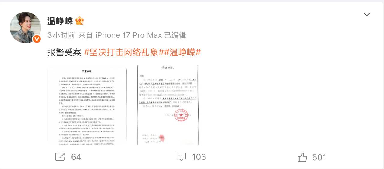 12月1日,演员温峥嵘在社交平台发文称,报警受案,并贴出了其所属MCN机构的严正声明以及一份受案回执。