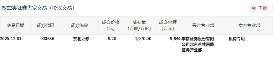 12月1日,东北证券大宗交易成交1070万股,成交额9844万元,占当日总成交额的19.99%,成交价9.2元,较市场收盘价9.21元折价0.11%。