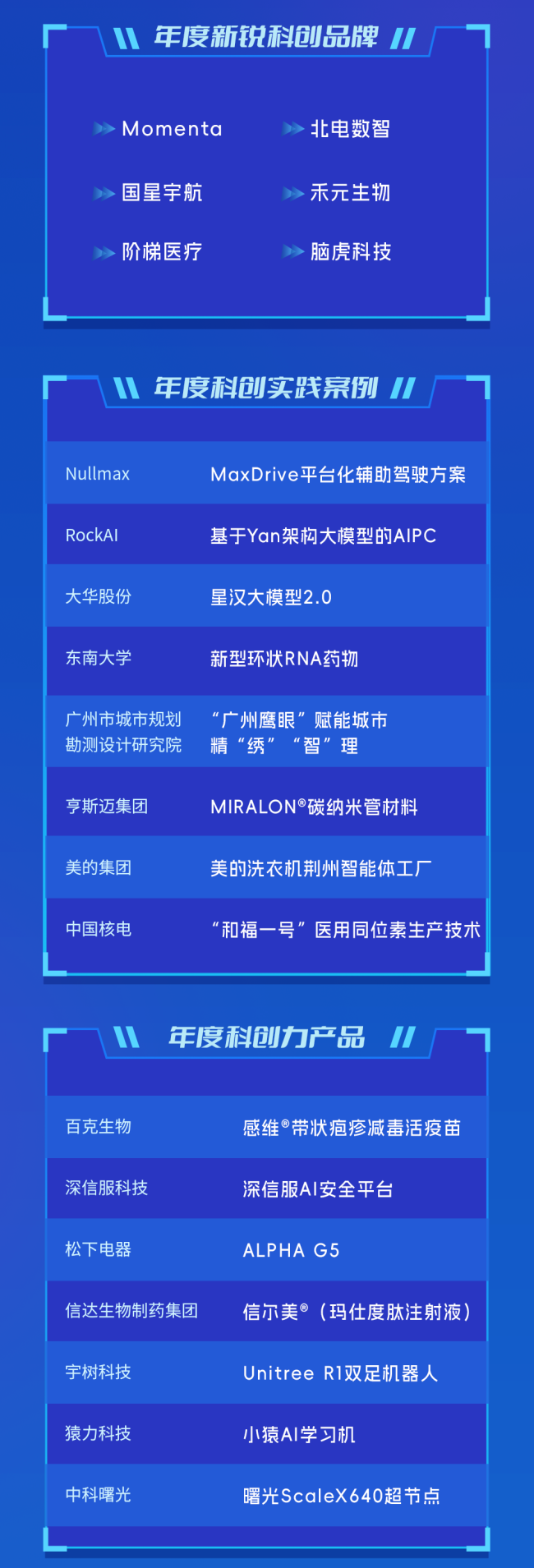 会上,除了“年度科创力人物”,2025科创大会还发布了“年度影响力科创品牌”“年度新锐科创品牌”“年度科创实践案例”“年度科创力产品”“年度杰出科创企业”等“年度科创力量”名单。