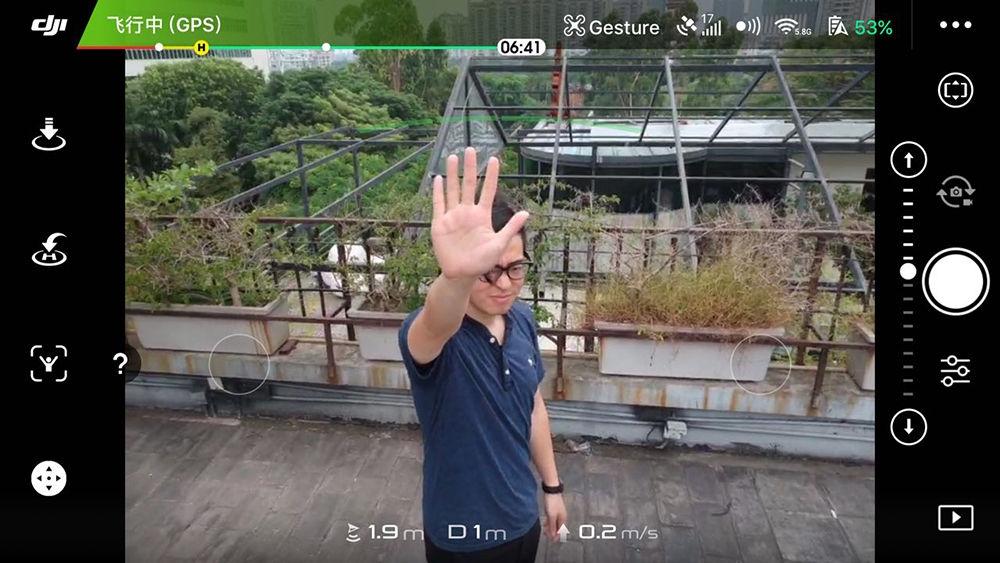 除了好的一面,我们也遇到了 Spark 的 bug,比如……从飞机到手的那一天开始,我就没有过一次成功的手势拍照,手势远离的触发率也不高。我们这台 Spark 可能是个特例,因为其他的 Spark 工程机都能够手势拍照。另外,DJI GO 4 无法在手势识别模式中摄像,只能拍照,这也使得举高双手自动跟随这个功能有点鸡肋,只是好玩和方便拍照取景。