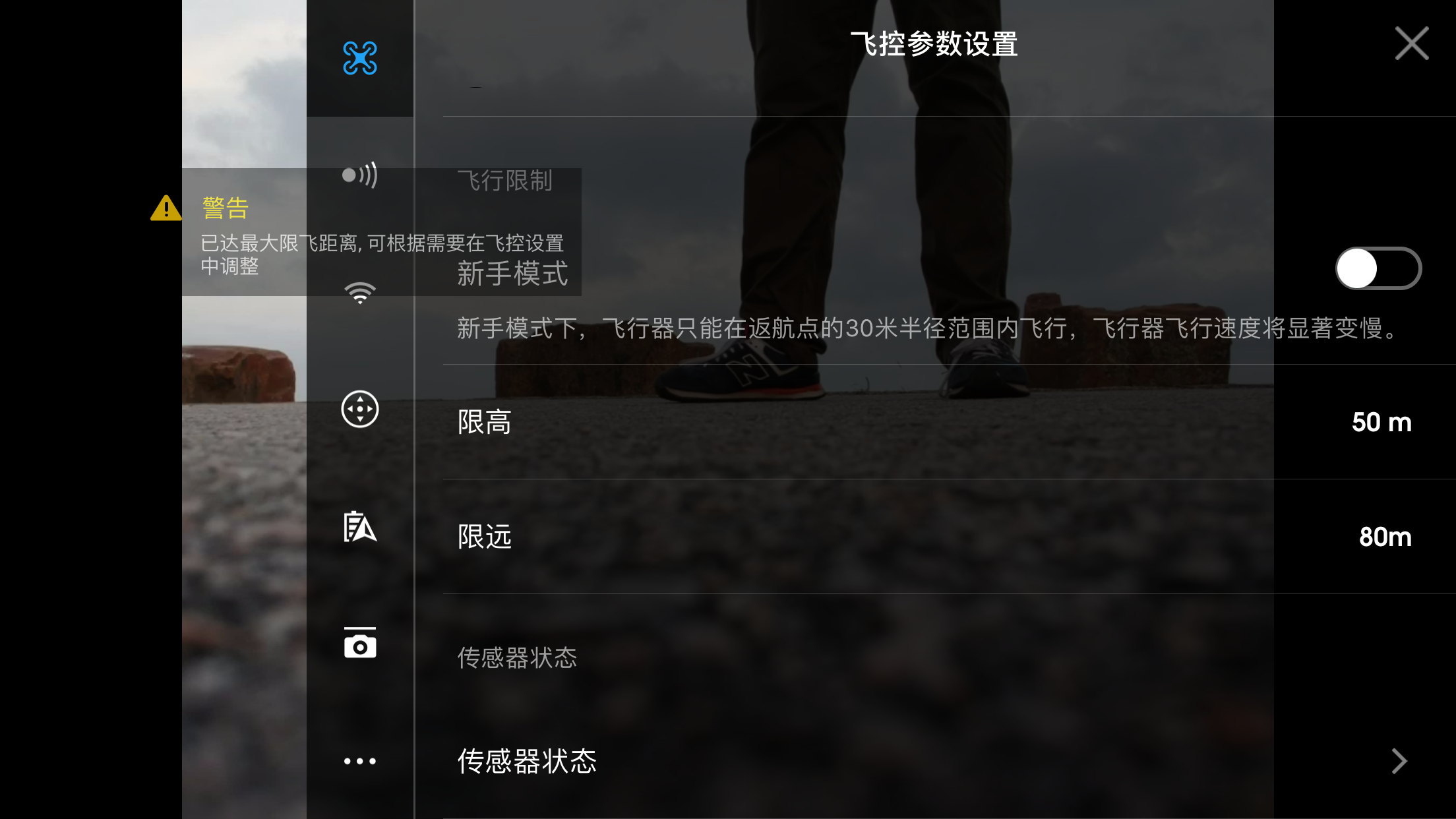 很多读者在爱范儿(微信号:ifanr)微信和开箱文章中求证控制距离,然而我们真的没法给出一个确切的回复,因为手势操控的时候飞机最远只能飞离我们 3 米,使用手机控制的话 DJI GO 4 将飞机高度限定在 50 米,距离限定为 80 米,低于官方宣传的 100 米且无法修改限飞距离。