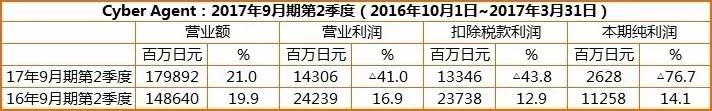 CyberAgent公布了2017年9月期第2季度(2016年10月1日~2017年3月31日)的业绩。报告期内,除了继续深耕手机市场,Cyber Agent还加大了对视频配信网站Abema TV的投资力度。本期营业额为1798亿92百万日元,同比增加21%;营业利润143亿6百万日元,同比减少41%;经常盈余133亿46百万日元,同比减少43.8%;纯利润为26亿28百万日元,同比减少76.7%。