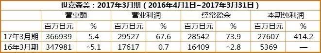 2017年3月期世嘉森美营业额为3669亿39百万日元,较上年同比增加5.4%;营业利润295亿27百万日元,同比增加67.6%;经常盈余285亿42百万日元,同比增加73.9%;全年度净利润为276亿7百万日元。