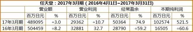 2017年3月期任天堂营业额达4890亿(其中,海外营业额为3590亿日元,占比73.4%),同比减少3%;营业利润293亿日元,同比减少10.7%。经常盈余503亿日元,同比增加74.9%;纯利润增幅明显,达1025亿,同比增加521.5%。