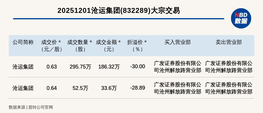 据每日经济新闻消息,2025年12月1日,新三板基础层公司沧运集团(832289,收盘价:0.9元)发生2笔大宗交易,总成交金额为219.92万元,成交金额最高的一笔成交价0.63元/股,成交数量295.75万股,成交金额186.32万元,折价30%。买入营业部是广发证券股份有限公司沧州解放路营业部,卖出营业部是广发证券股份有限公司沧州解放路营业部。