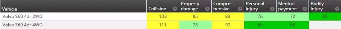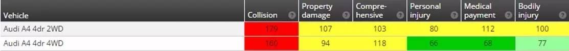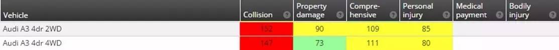 其实从这里开始,小伙伴们就能发现,车上人员赔付数值属于黄色平均线了,和A4表现类似,四驱奥迪A3好于前驱。看到这马上要后台留言说这货是紧凑型的小伙伴们,不要急,榜单从IIHS那来,美国的级别划分很宽泛,也不太看重轴距,就这么任性。不过需要注意的一点,A3美国版标配主动刹车,国内这个配置只能选配。