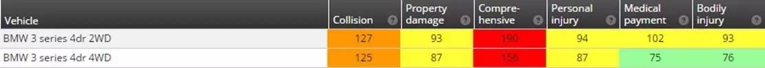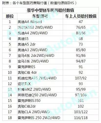 宝马3系的四驱版本也好过两驱,国内想买四驱宝马3系,恩,那得是顶配才有,四驱不仅仅在车上赔付这项数值低,在医药费赔付数值上和行人这项数值都更低,如果按照两驱的成绩排,宝马3要掉到12名以后。