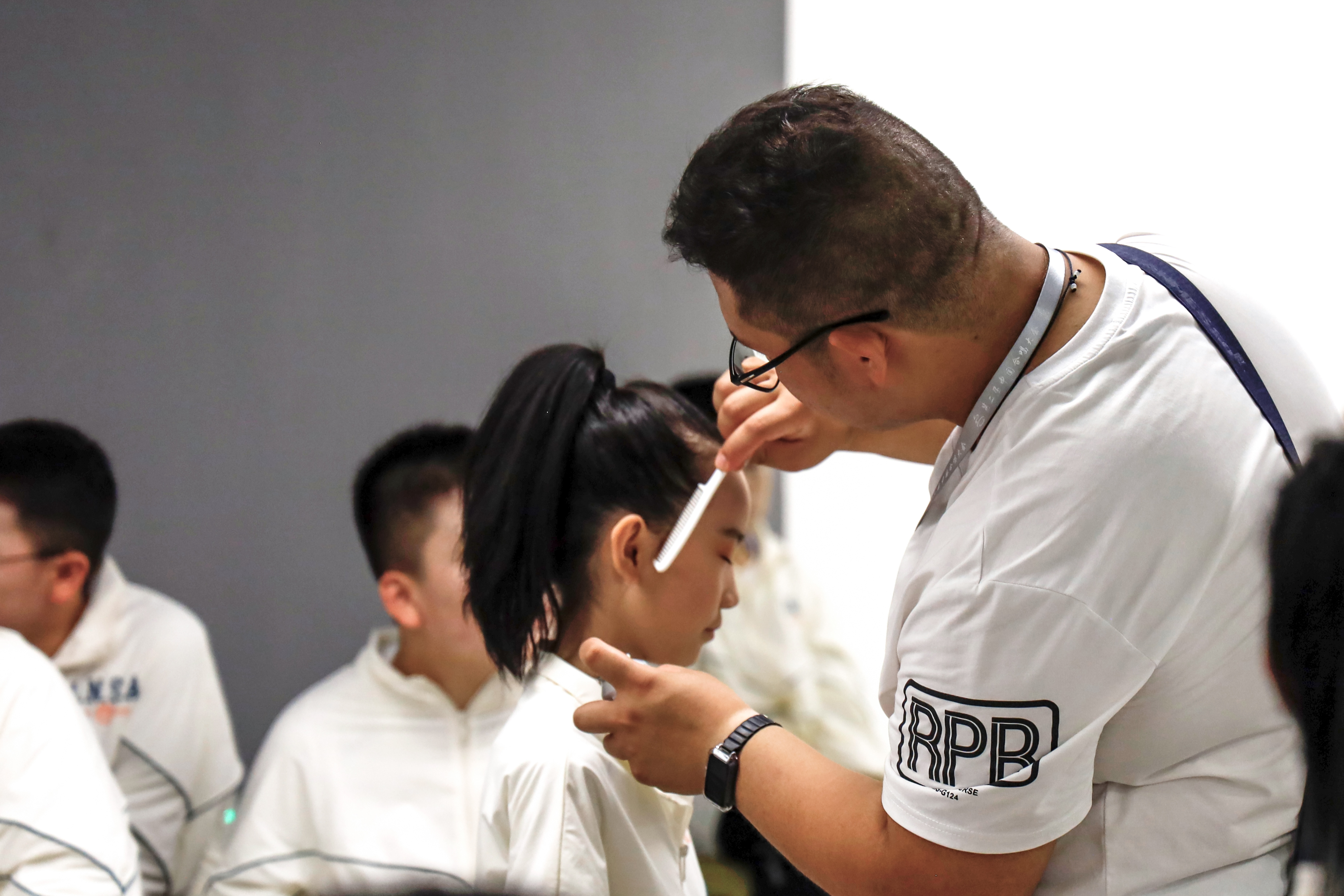(赛前,静乐县童声合唱团辅导老师为孩子们整理妆造)
