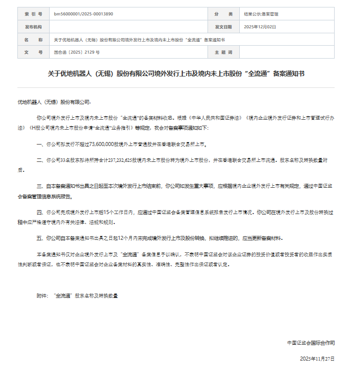 12月2日,证监会发布《关于优地机器人(无锡)股份有限公司境外发行上市及境内未上市股份“全流通”备案通知书》。通知提出,该公司拟发行不超过73,600,000股境外上市普通股并在香港联合交易所上市。该公司33名股东拟将所持合计237,232,625股境内未上市股份转为境外上市股份,并在香港联合交易所上市流通。