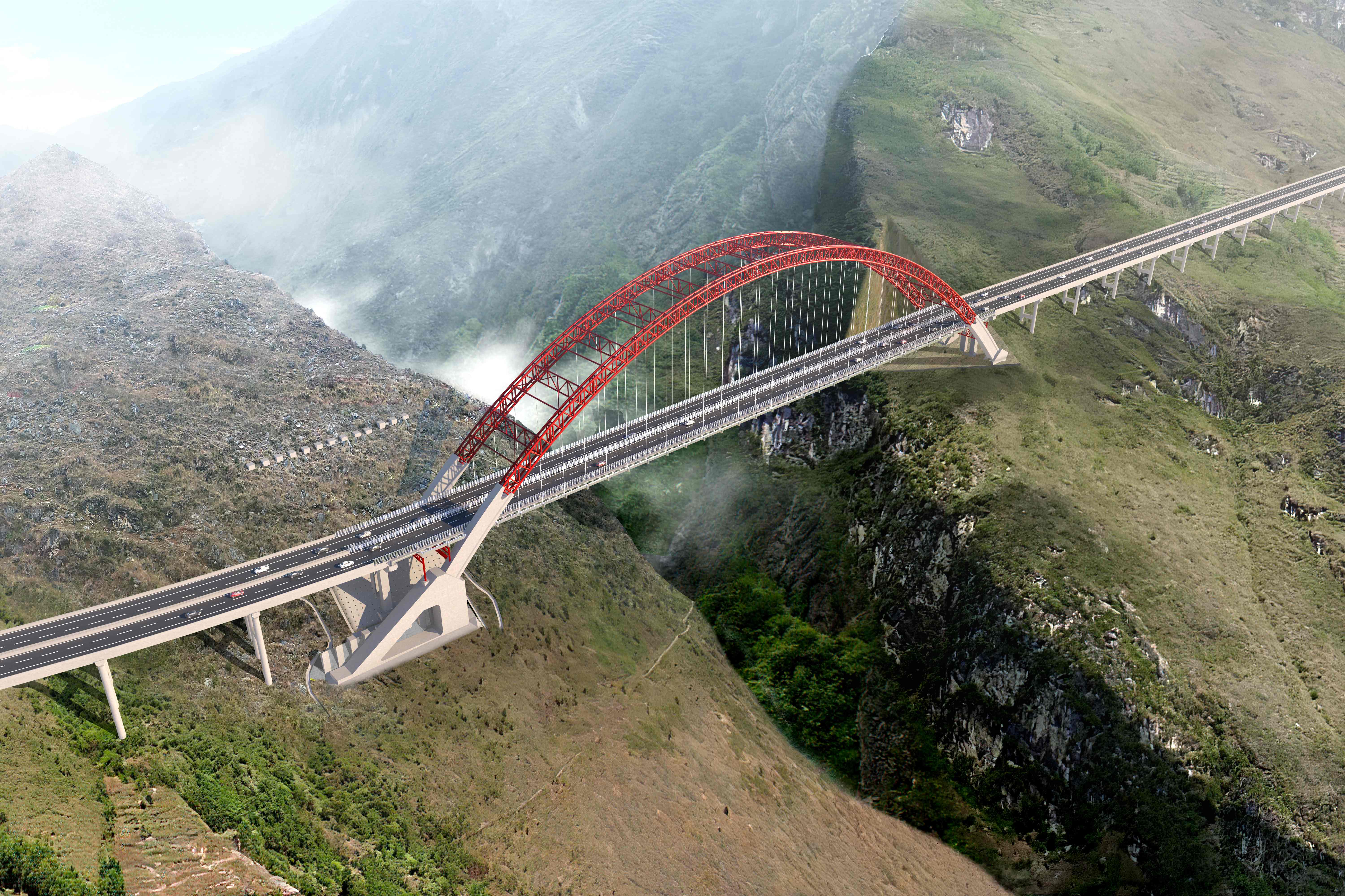 面对复杂地形与地质条件的严峻挑战,建设团队以两项核心技术突破实现了高效建造:一是国内首创的非对称高低主拱设计,二是全装配化施工工艺的全面应用。非对称高低主拱设计的创新性在于,利用横向内外侧主拱的非对称设计来主动适应陡斜坡地形,并因地制宜采用马蹄式、三竖桩式及斜桩竖桩混合式三种不同的拱座结构形式支撑主拱设计。这种“量身定制”的设计,完美适应了峡谷两岸不平顺的地形与复杂地质,在绝对保障结构稳固的前提下,显著减少了拱座开挖量和混凝土工程量,有效控制了造价,提升了边坡稳定性,从根源上解决了复杂地形下的结构受力平衡难题。为克服大型构件山区运输困难、现场施工场地受限等瓶颈,团队实施全装配化施工工艺的全面应用,利用前期搭建的6000平方米的全装配化钢平台(约合20个标准篮球场),作为“现场工厂”。这一工艺实现了构件从工厂化预制到现场精细化加工、模块化组装的全程精准控制,从源头上解决了“巨构积木”的生产与高效组装问题。这两大技术的协同应用,显著提升了大桥对复杂环境的适应性,大幅节约了资源投入,增强了结构整体稳定性,为大桥的顺利合龙提供了有力支撑。