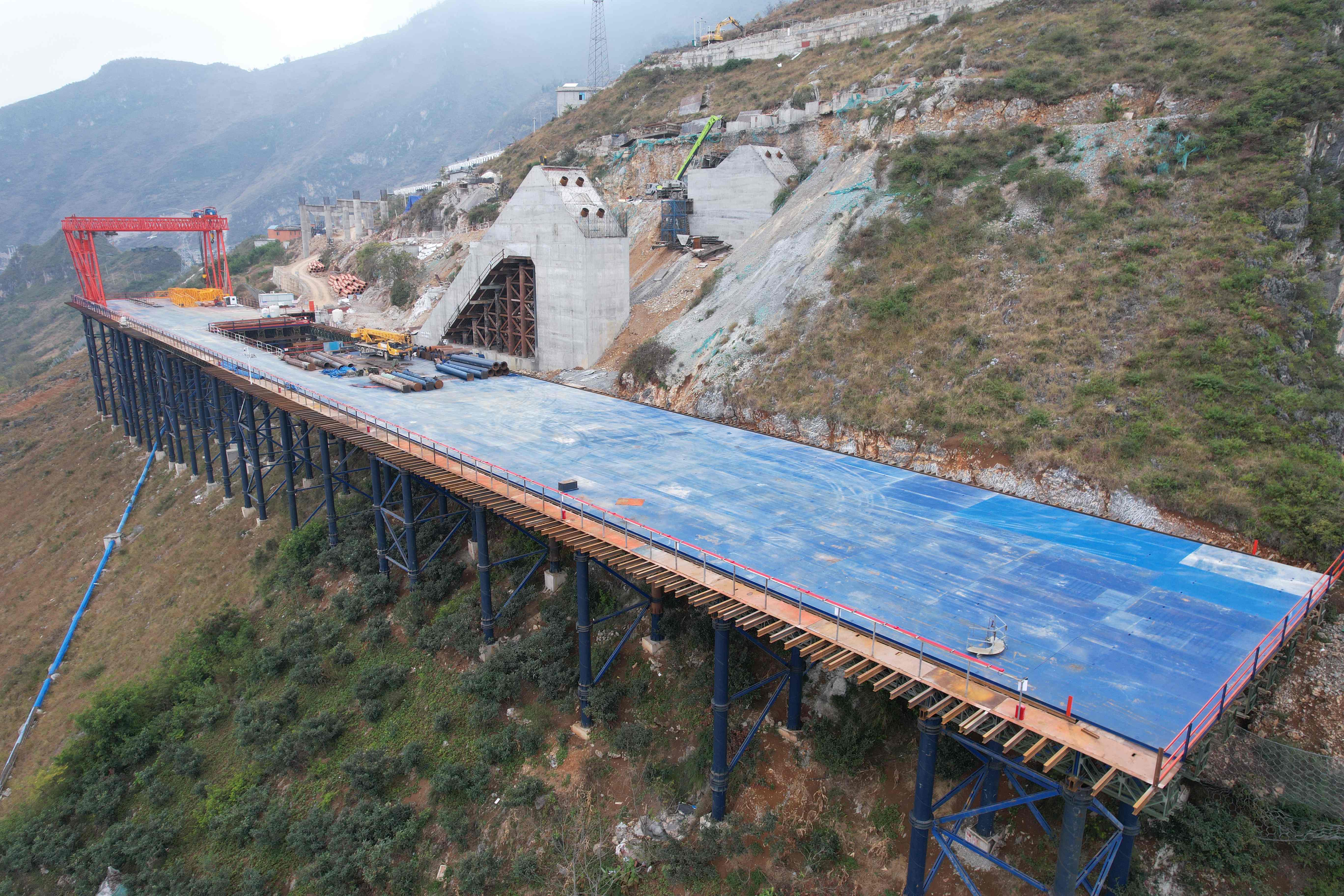 为克服大纵深峡谷地形带来的施工挑战,建设团队成功探索形成《复杂地形条件下标准化全装配钢平台快速搭设施工工法》和《山区陡坡地形大尺寸重型构件斜轨运输施工工法》2项创新工法,有效解决了陡坡作业条件下重型构件运输与安装难题,为整体工程的质量把控与进度控制提供了关键技术支撑。
