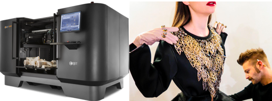 图1左:某工业用3D打印机,成型材料应为塑料(来源网络);图1右:以金属作为原材料3D打印成的饰品(来源网络)