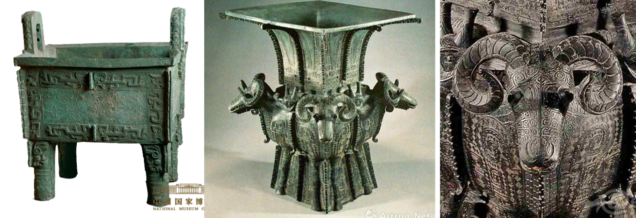 图4左:司母戊大方鼎(来源网络)图4中:四羊方尊(来源网络);图4右:四羊方尊局部,体现出铸造便于形成复杂形状的特点(来源网络)