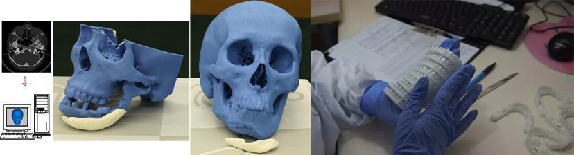 比如文初提到的3D打印人造卵巢。现在,医用钛合金人工骨,人工关节等已经广泛采用了3D打印技术。首先通过CT或者核磁共振等成像技术获知患者身体的精确三维结构,然后将数据利用计算机进行处理并完成个性化设计。之后利用3D打印生成独一无二的专属人工骨,极大的提升了患者的治疗质量。