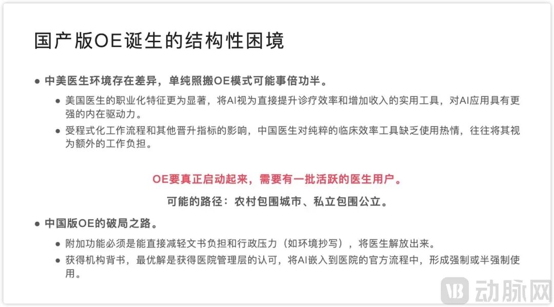 OpenEvidence能成功,根本在于美国医生是独立决策者,可自主下载App,有消费级产品使用习惯。而国内医生执业在公立医院体系内,工具采购需医院审批,个人免费工具难以进入核心流程。因此,无论是走B端路线,绑定医院系统或是API解决方案,都是围绕体系而非个人进行。