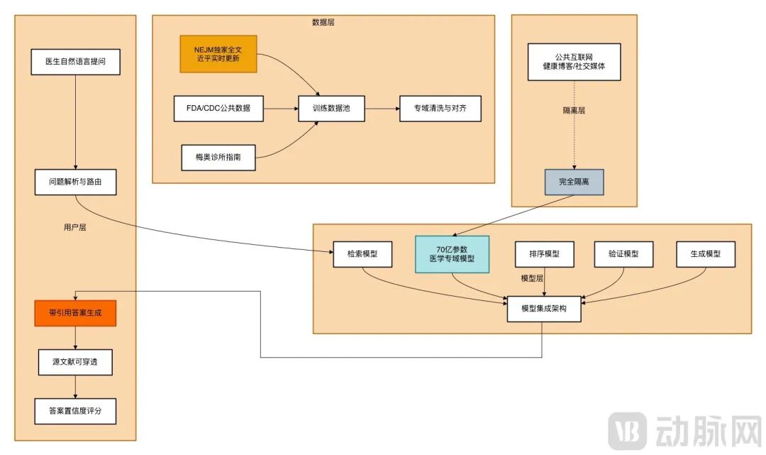 OpenEvidence摒弃了通用AI“参数竞赛”的逻辑,走垂直知识深化路线,其技术体系围绕“垂直化模型训练”、“证据可信度”和“医疗场景可用性”三大核心构建。