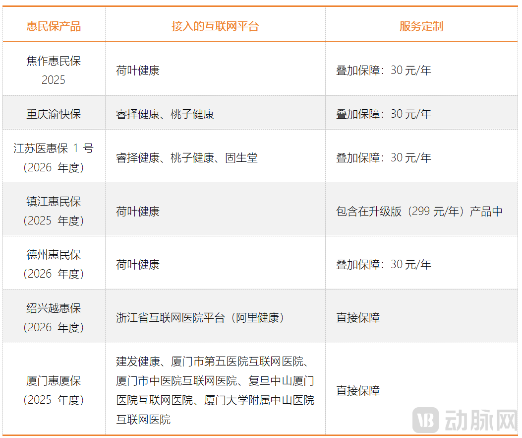 近两年,在主体保险条款之外设置附加险,或者在基础版产品之外增加升级版,成为惠民保的另一个趋势。动脉网注意到,在这些叠加的保障中,增设互联网门诊险成为主流。据动脉网不完全统计,焦作、重庆、江苏、德州等多地惠民保,通过叠加保障或者升级保障的方式,覆盖互联网医院门诊的医疗费用支出,绍兴和厦门则直接接入互联网医院平台。