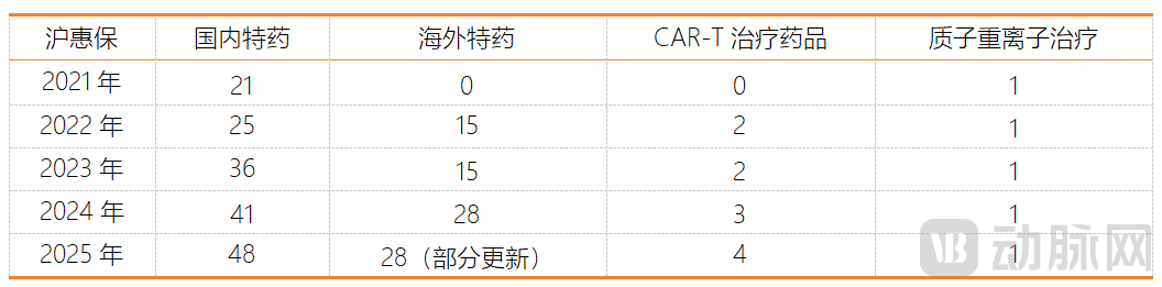在惠民保中,覆盖医保外费用的条款通常被作为核心保障。以国内参保人数最多的沪惠保为例,保障条款主要就集中在医保外的自费部分,包括特定住院自费医疗费用保险金、国内特定高额药品费用保险金、质子重离子医疗保险金、海外特殊药品费用保险金和CAR-T治疗药品费用保险金。此外,沪惠保自2021年4月上线以来,经过了保障条款的多次迭代,其中一个重要模块即更新新特药目录。在2025版的沪惠保中,已经有48款国内特药、15款海外特药、4款CAR-T治疗药物和1款质子重离子治疗被纳入报销范围。