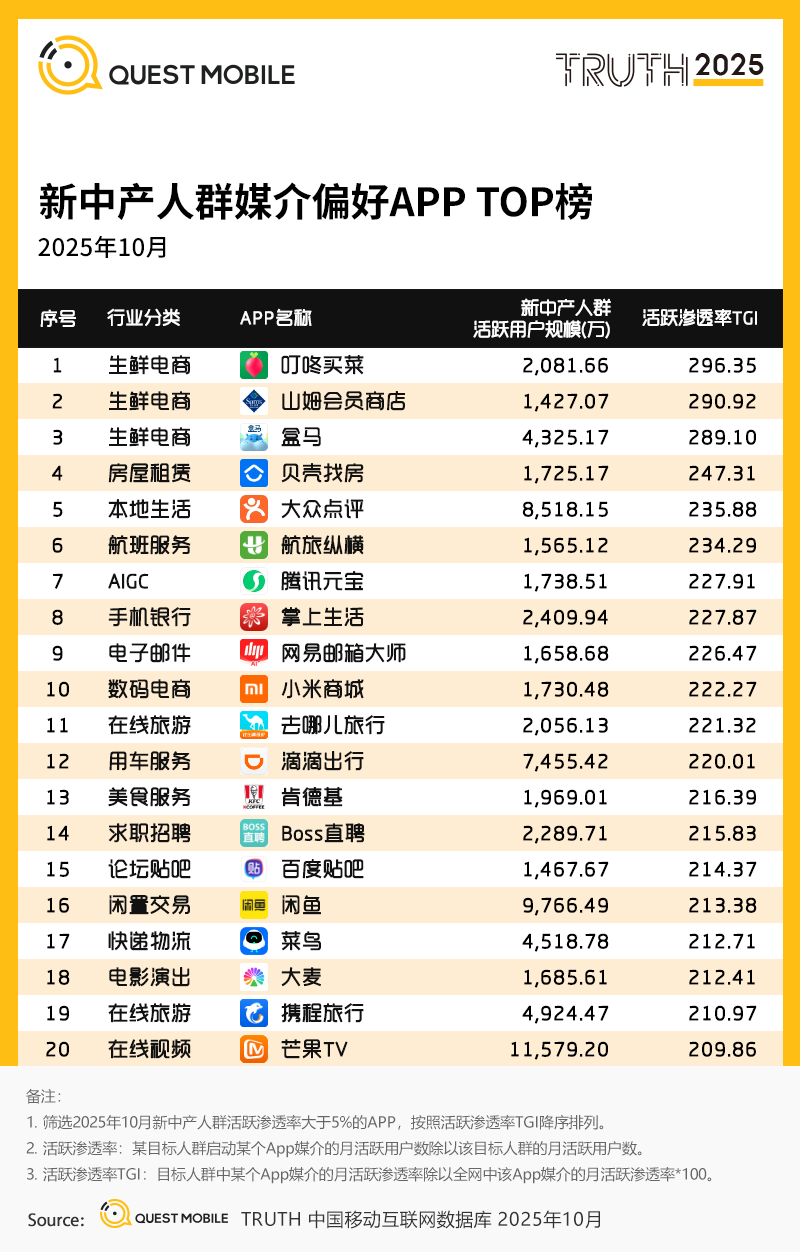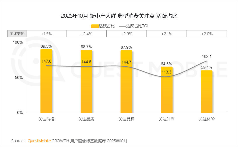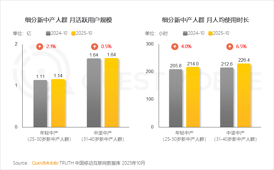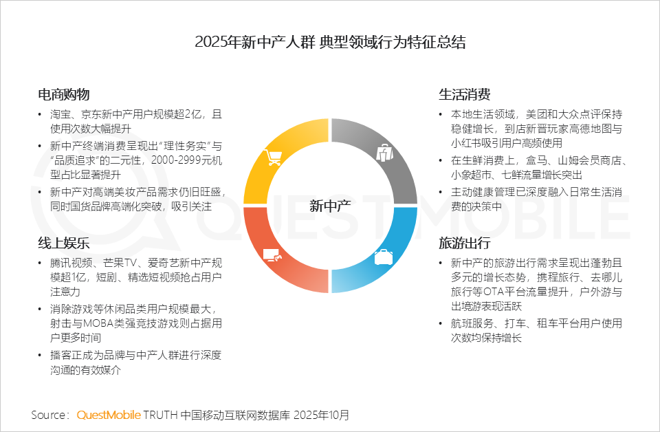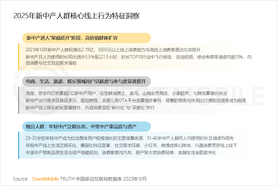 QuestMobile数据显示,2025年10月新中产人群用户规模达到2.78亿,同比净增长317.4万,全网占比微降0.2个百分点。