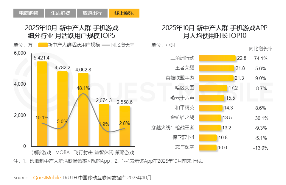 12、新中产游戏偏好呈现“休闲+竞技”双轨并行特征,射击与MOBA类游戏主导用户时长,且游戏时长呈现上升趋势,新兴游戏如《三角洲行动》《燕云十六声》表现更加突出