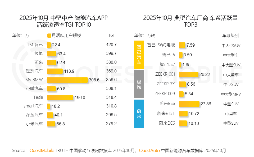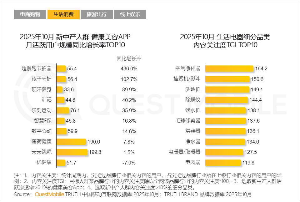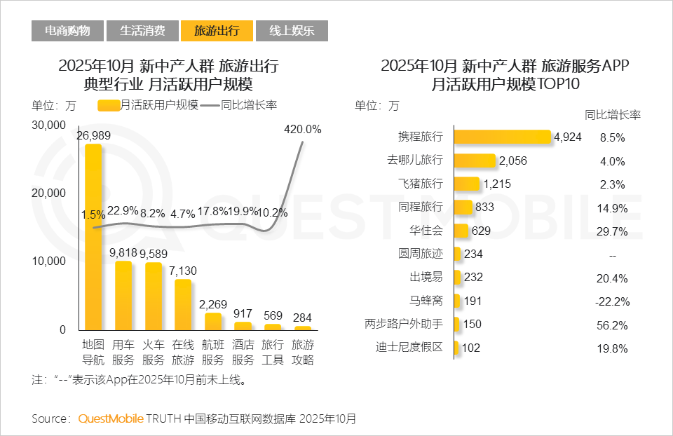 第三,休闲旅游新业态,以及AIGC、智能汽车、智能健康等新产品和服务的持续进化,则为新中产群体的消费需求释放提供了可靠路径。2025年10月,旅游攻略、AIGC、飞行射击(游戏)、智能健康、汽车社区占据了月活用户规模增长率TOP5的位置,同比增长分别达到420%、165.1%、48.1%、37.4%和36.7%!