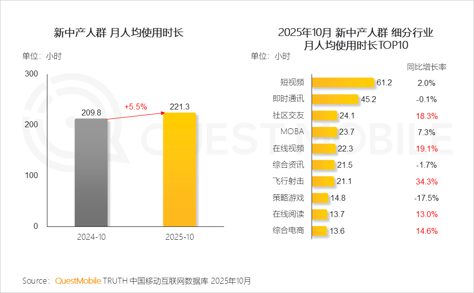 5、新中产群体互联网使用时长显著提升,TOP10行业中,飞行射击、在线视频、社区交友、综合电商、在线阅读行业同比增速均超过10%,显示出内容消费与社交互动领域的强劲需求