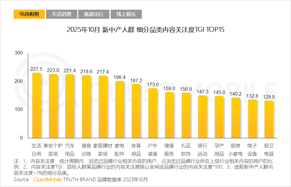 3、中坚中产聚焦品质生活与资产稳健规划,汽车、房产等大宗消费意愿凸显,对生鲜电商、旅游出行的需求远超同龄人