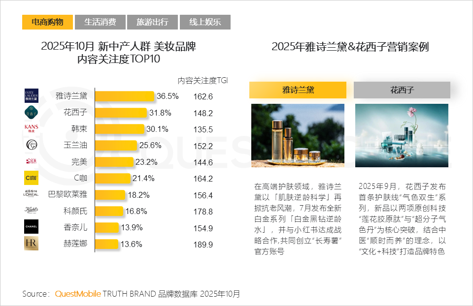 数据显示,截止到2025年10月,新中产人群规模达到2.78亿,同比增加了300万,其中,一线城市用户占比、线上消费能力3000元以上用户占比同比分别增加了1%和1.7%,高价值用户持续扩容的趋势明显。