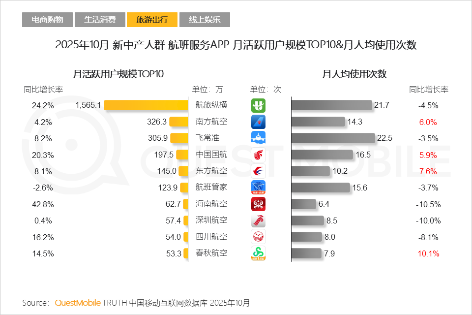 9、新中产商务与休闲出行频繁,航班服务平台成为高频刚需工具,南方航空、中国国航等航司APP使用次数提升