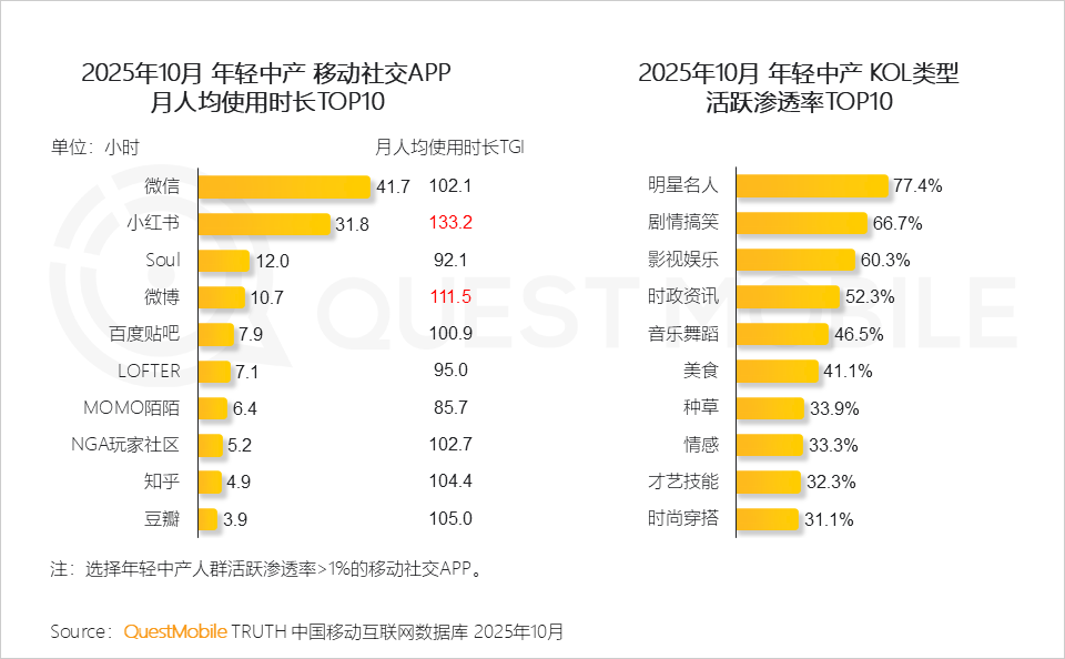 4、社交APP是年轻中产的“数字生活中心”,小红书与微博成为内容消费的核心阵地,知乎、豆瓣等垂直社区满足深度兴趣,内容偏好上,娱乐化内容占据主导