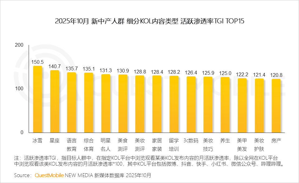 6、新中产人群的KOL内容偏好呈现品质生活导向与兴趣垂直深耕双重特征,关注语言、留学等自我提升领域,也热衷于美妆、3C数码、养生等生活消费内容
