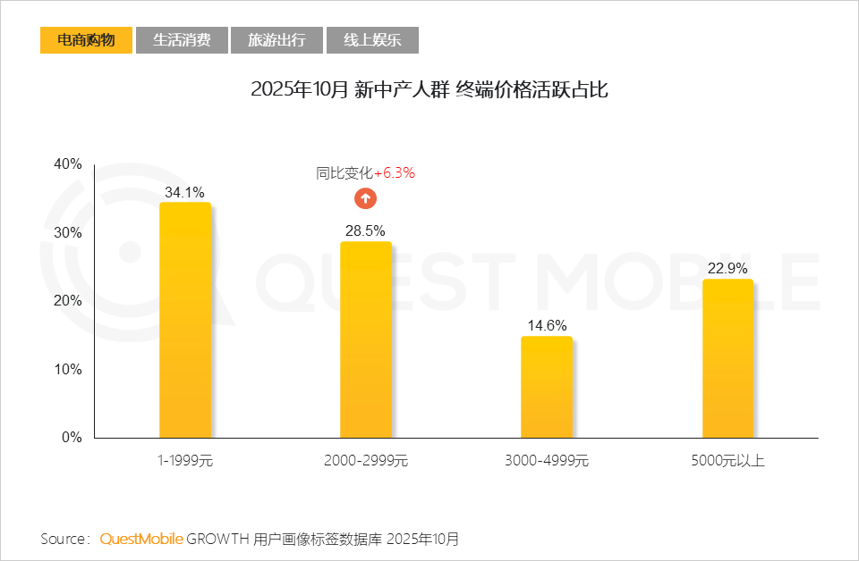 这些变化,带来了新中产人群线上行为特征的跃迁,务实和品质成为核心标签,例如,电商平台使用方面,淘宝、京东活跃新中产用户量分别增长了3.1%和11.8%;在终端价格方面,新中产用户使用中端机型(价格在2000元到2999元之间)占比达到28.5%,同比增长了6.3%。