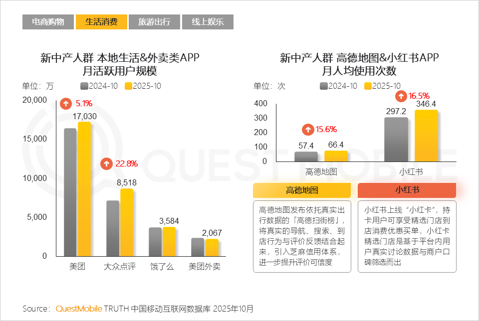 5、本地生活方面,美团、大众点评流量持续增长,到店新晋玩家依托“真实出行数据”和“真实内容讨论”构建起信任经济,提升中产群体使用频次