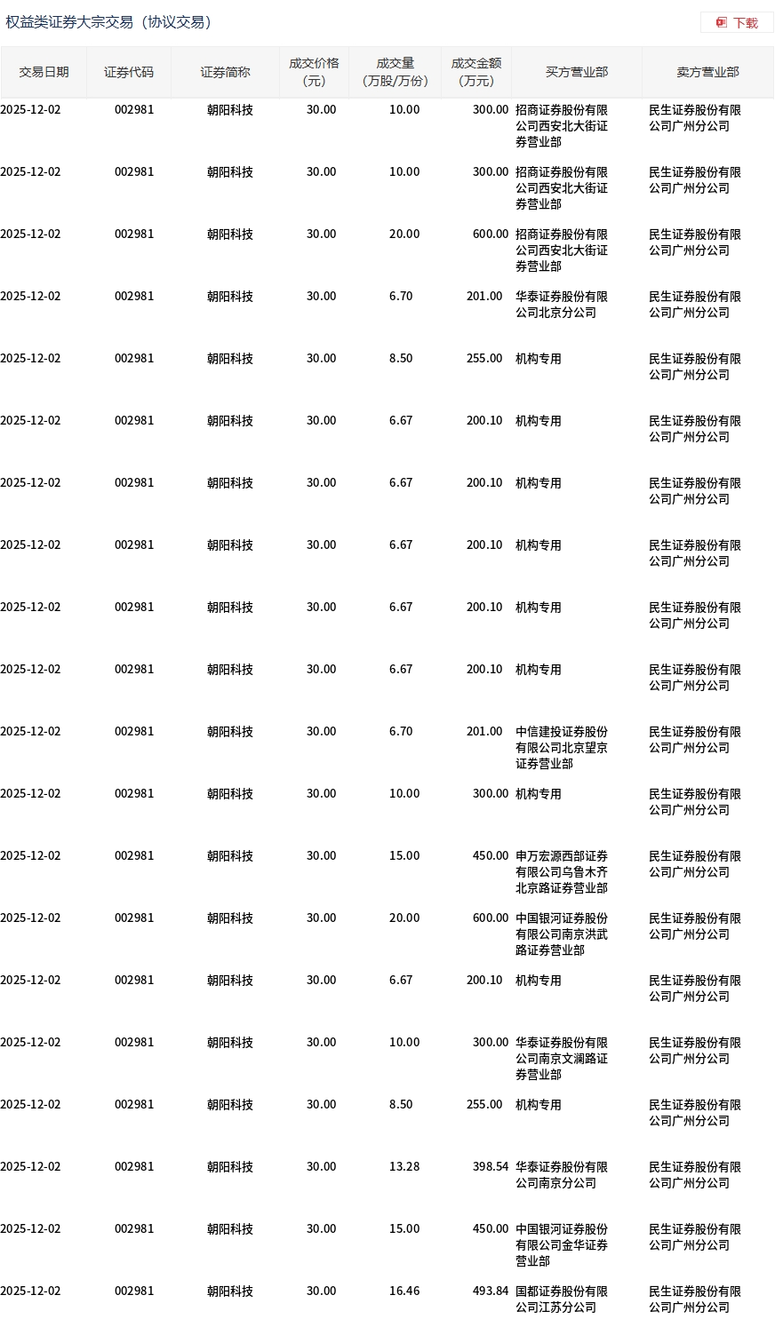 12月2日,朝阳科技大宗交易成交270.5万股,成交额8115.18万元,占当日总成交额的9.02%,成交价30元,较市场收盘价35.16元折价14.68%。