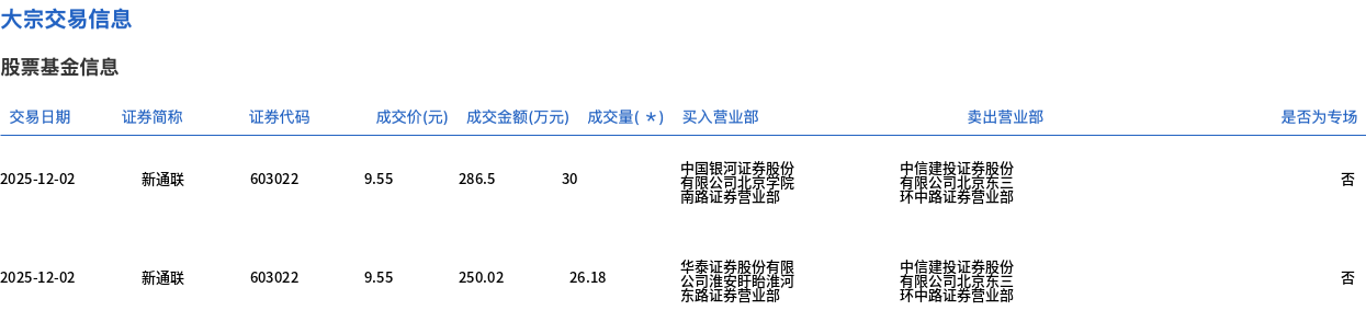12月2日,新通联大宗交易成交56.18万股,成交额536.52万元,占当日总成交额的12.93%,成交价9.55元,较市场收盘价10.49元折价8.96%。