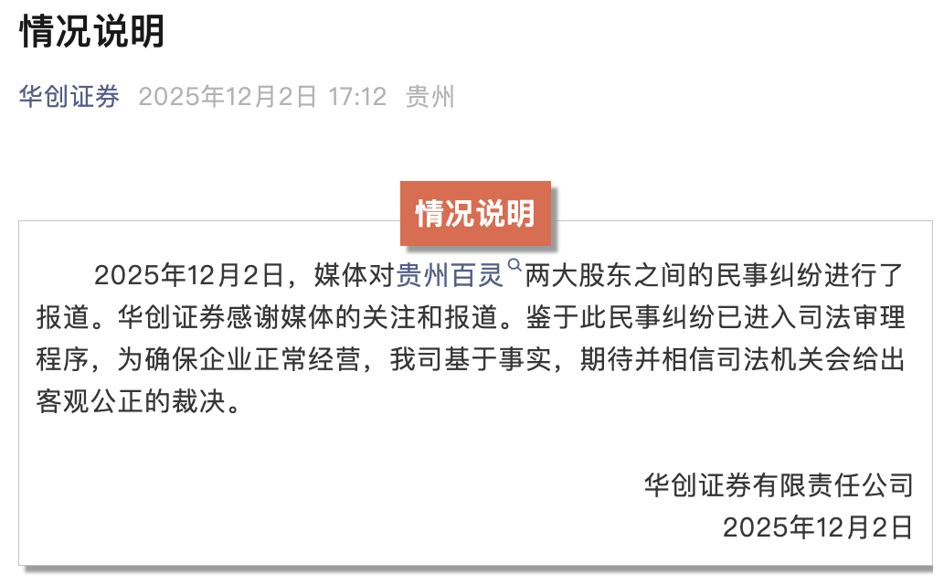 12月2日,华创证券发布情况说明称,2025年12月2日,媒体对贵州百灵两大股东之间的民事纠纷进行了报道。鉴于此民事纠纷已进入司法审理程序,为确保企业正常经营,公司基于事实,期待并相信司法机关会给出客观公正的裁决。